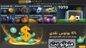 سایت منوتو بت یا همان manotobet یکی از سایت های معتبر و محبوب برای شرط بندی آنلاین است. در واقع به کاربران امکان می دهد در انواع بازی های کازینو و مسابقات ورزشی شرط بندی کنند. این سایت شرط بندی با واریز مستقیم با طراحی کاربرپسند و ارائه خدمات متنوع توانسته است توجه بسیاری از علاقه مندان به شرط بندی را به خود جلب کند.